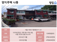 [땅집고] 지은 지 50년쯤 된 전용 8평짜리 다세대주택이 첫 입찰에서 감정가의 2배에 팔려 화제다. 국내 최초 AI 경·공매 분석 플랫폼 땅집고옥션(☞바로가기)에 따르면 해당 물건은 서울 마포구 합정동 81-23일대 양지주택 나동 ...